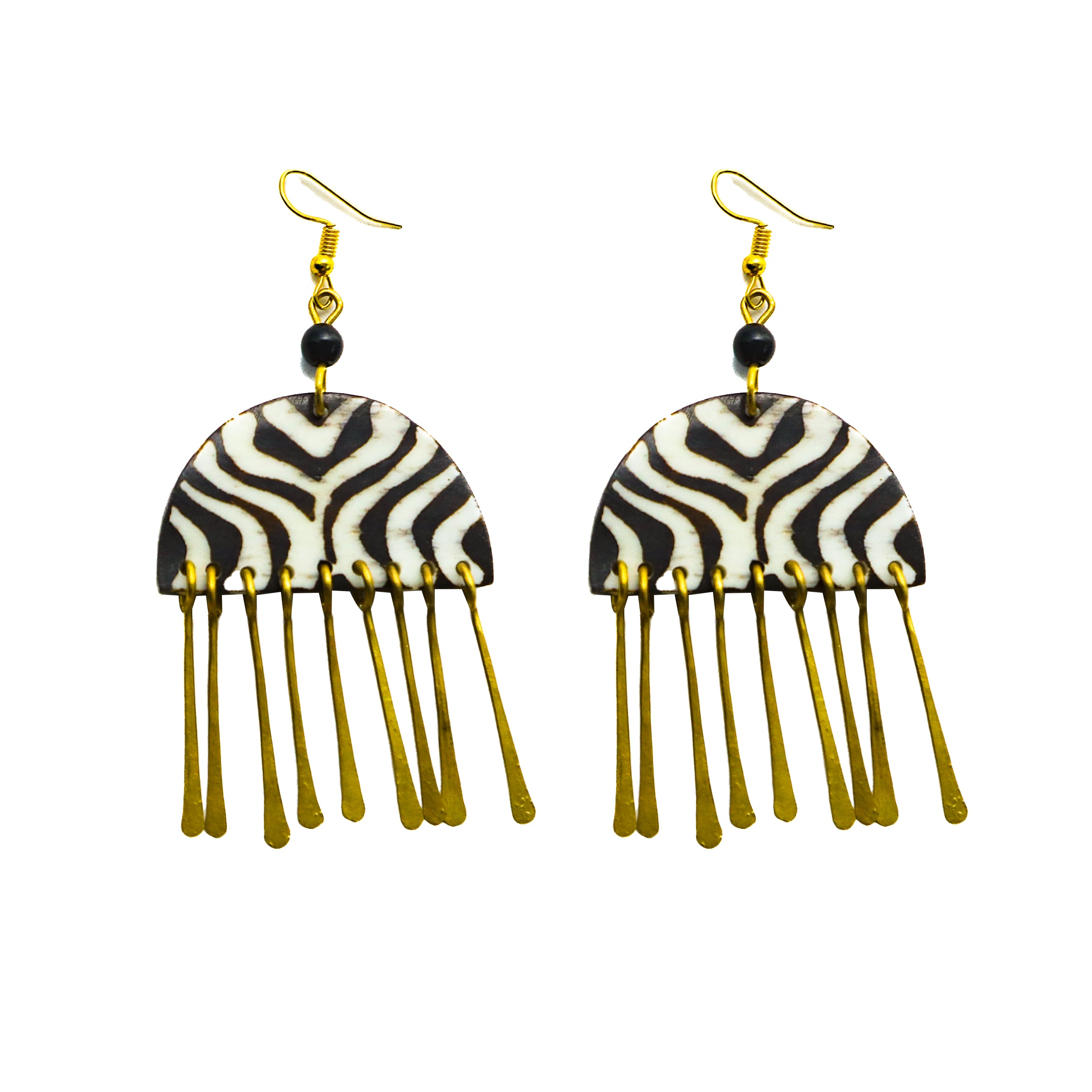 The Asiya earrings embody a unique and modern style. Crafted with a semicircle of recycled cow horn, the brass fringe accents offer an effortless juxtaposition of whimsical and everyday wear. Ethically sourced materials and fashion-forward design make it an ideal choice.