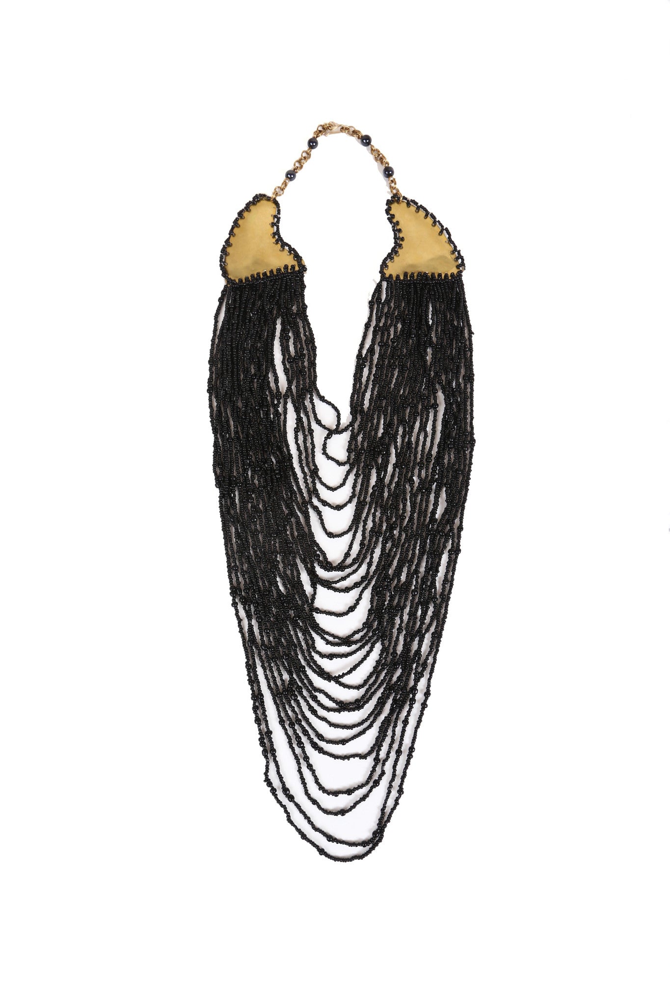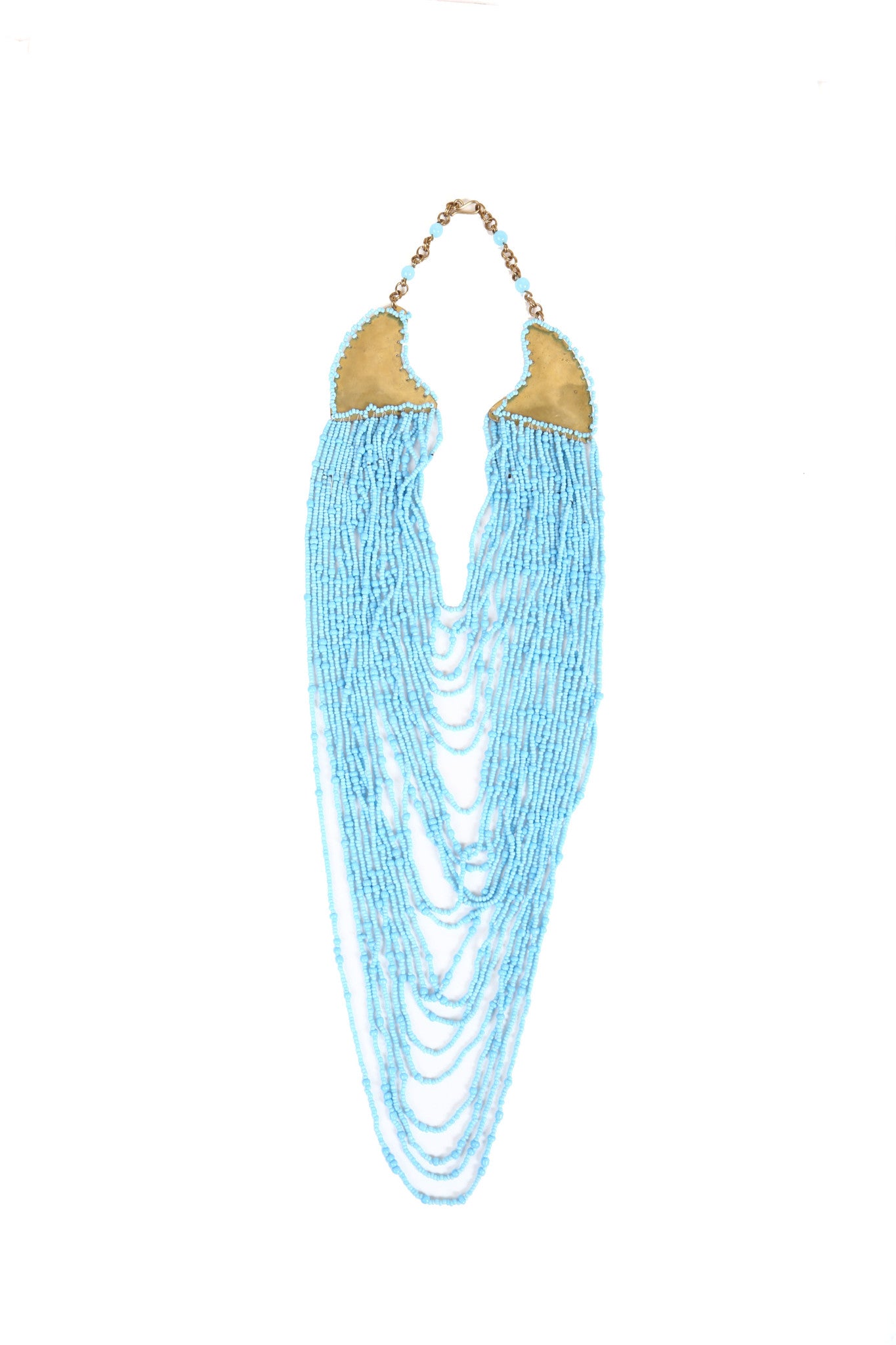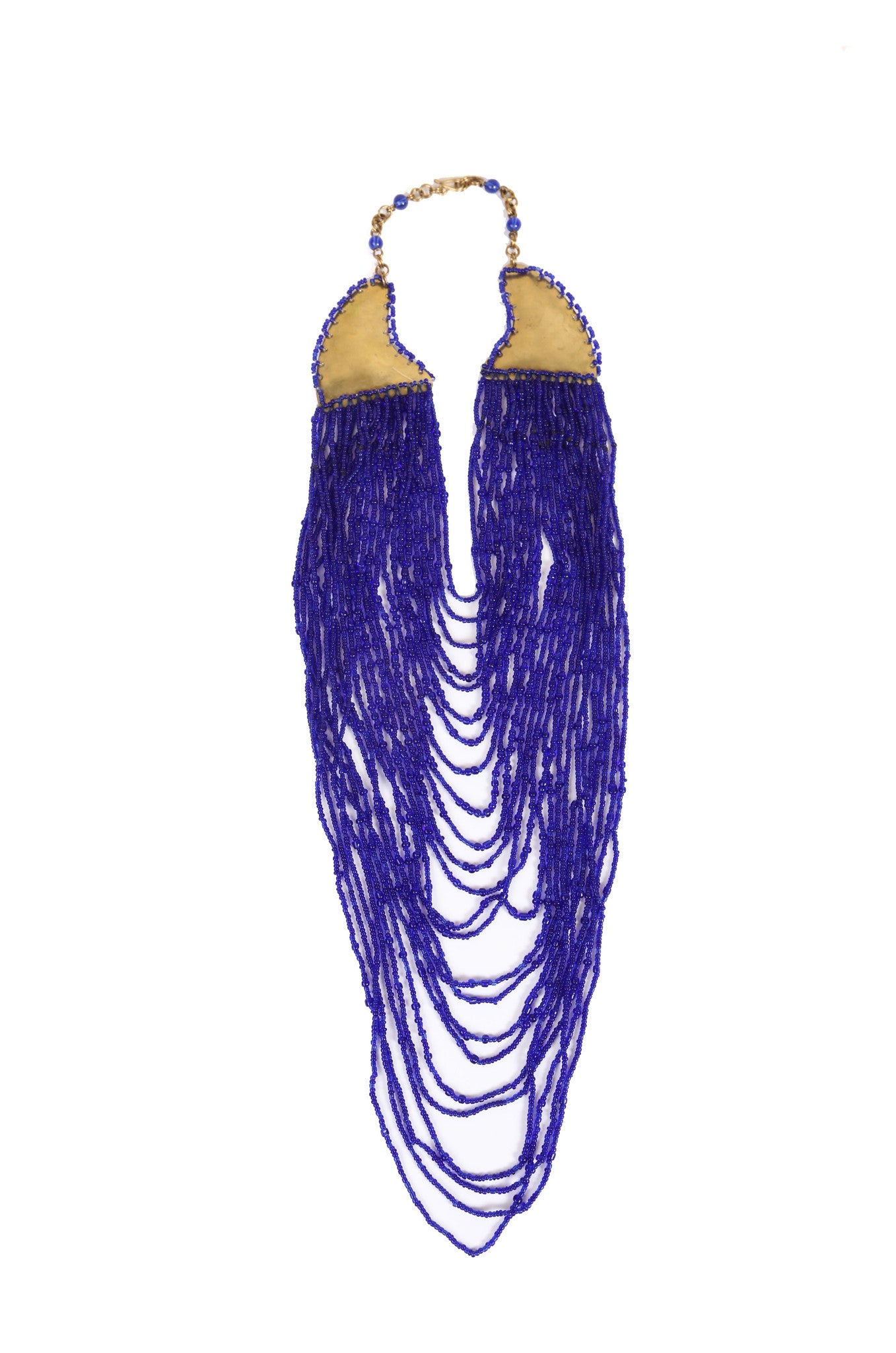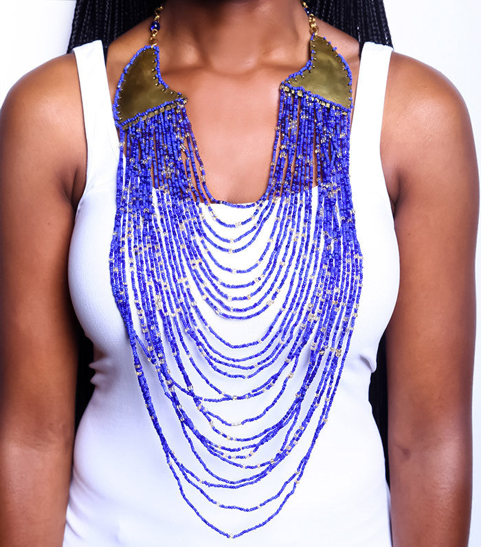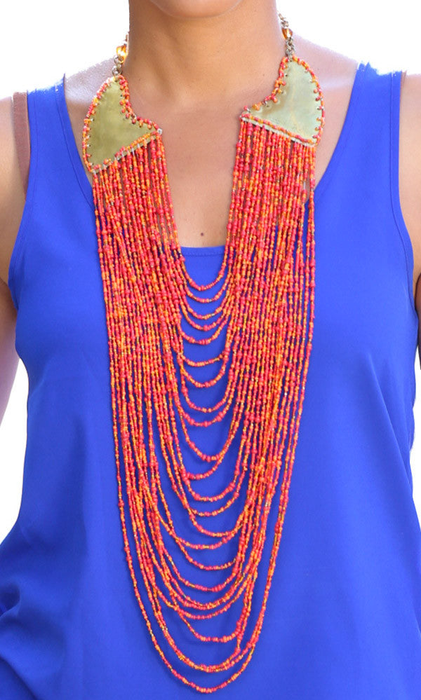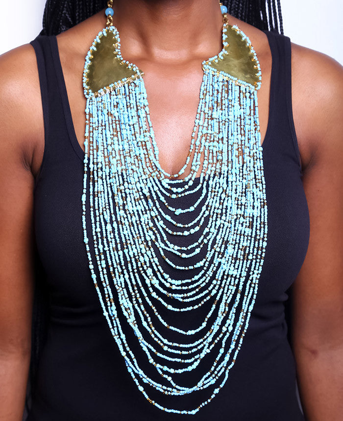 The Nala Necklace is guaranteed to add a royal touch to any outfit! This brilliantly crafted statement piece has 24 strands of ornately detailed glass beads, all strung together and hand-loop through a brass connector for an elegant, cascading effect. And the best part? It’s totally unique - each one of the individual threads makes up a sparkling tapestry that’s sure to leave a lasting impression.